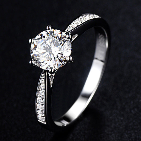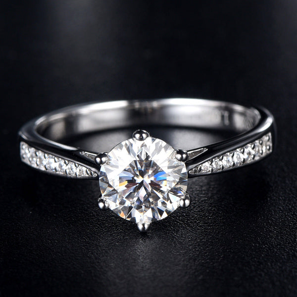 Forever One Moissanite Elegant Engagement Ring exudes timeless elegance and sophistication, Featuring a stunning round-cut Moissanite stone that measures 6.5mm and is surrounded by 14 smaller stones, you can give your loved one a gift that truly sparkles and shines. It's the perfect choice for any special occasion, whether it's a proposal or an anniversary celebration. Forever One Engagement Ring ring is not just a piece of jewelry, it’s a symbol of your love and devotion. Don’t hesitate to get this ring and propose to your partner with confidence.